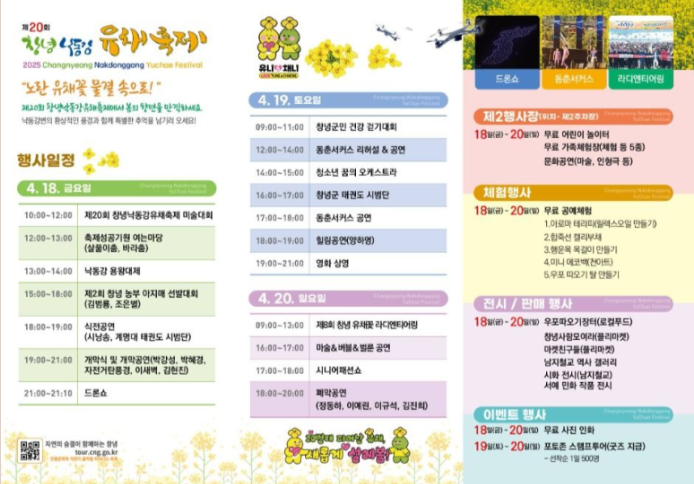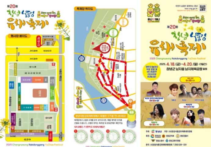 2025년 제20회를 맞이한 '창녕낙동강유채축제'는 원래 4월 10일부터 13일까지 예정되어 있었으나, 일정이 축소 및 연기되어 2025년 4월 18일(금)부터 20일(일)까지 3일간 진행됩니다.